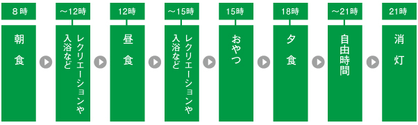 ここでご紹介しているのは「1日の流れ」は、ほんの一例です。 私たちスタッフ一同は、ご利用者の「安心と健康」を第一に考え、24時間体制でいつでも見守っています。そのために各ご利用者お一人おひとりに合った介護メニューを、ご家族の皆様とお話し合いを持ち、一緒に考えご提案いたしております。 集団でありながら、個人を尊重した心安らぐ施設でありたい。私たちはそう願って、お一人おひとりに寄り添いながら介護にあたっています。
